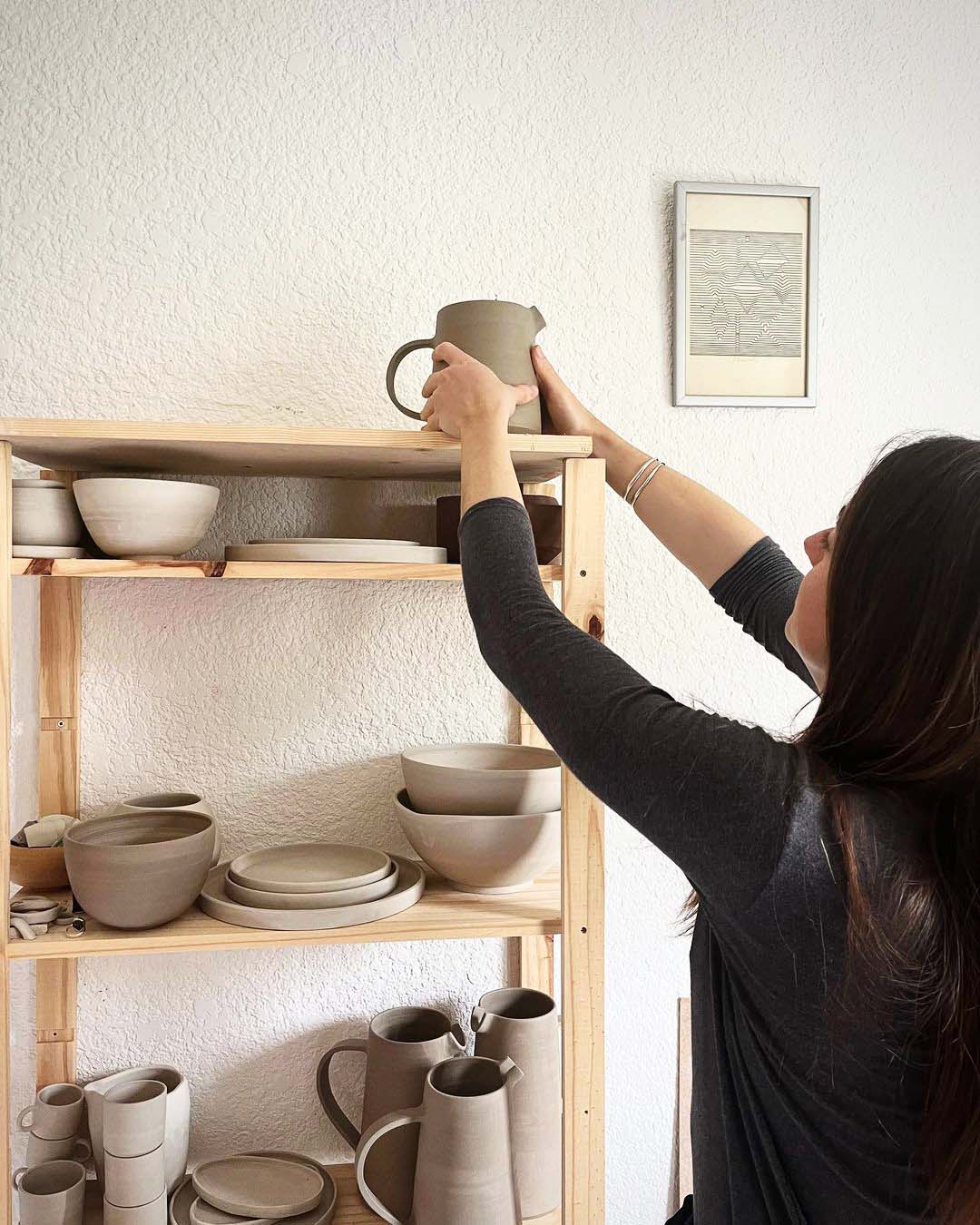 She mainly uses the pottery wheel to create her pieces but she also employs other techniques such as pinched pottery or slab building. Creating ceramic pieces is a long process for her. First, she builds the global shape. The next day, she makes the finishings and adds handles or other details. Then, the piece will dry for a couple of days. After that, it's time for bisque firing (around 980°C). She glazes the pieces and fires them again at 1280°C. From start to finish, around 3 to 4 weeks have passed.