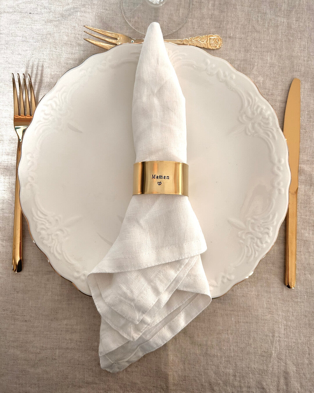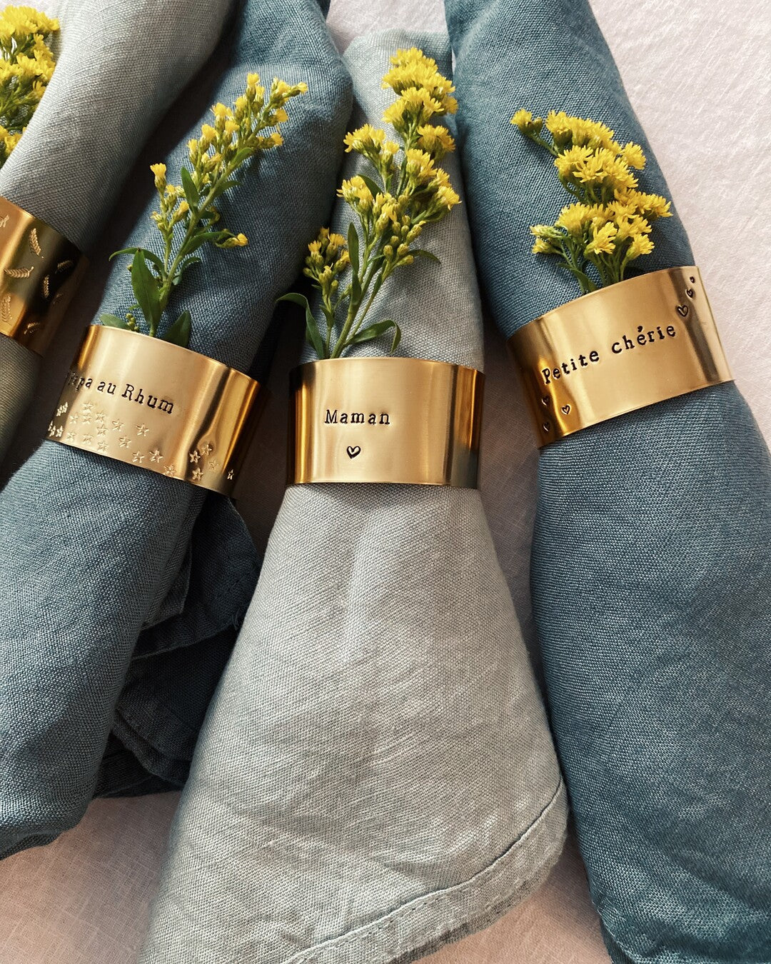 Her inspiration for napkin rings came from a childhood memory — engraved ones her grandfather kept, each bearing a family member’s name. After the birth of her son, Élodie became more mindful of daily rituals and sought lasting alternatives to disposable habits. Switching to fabric napkins, she imagined a personalized ring to mark each one — beautiful, useful, and full of meaning.