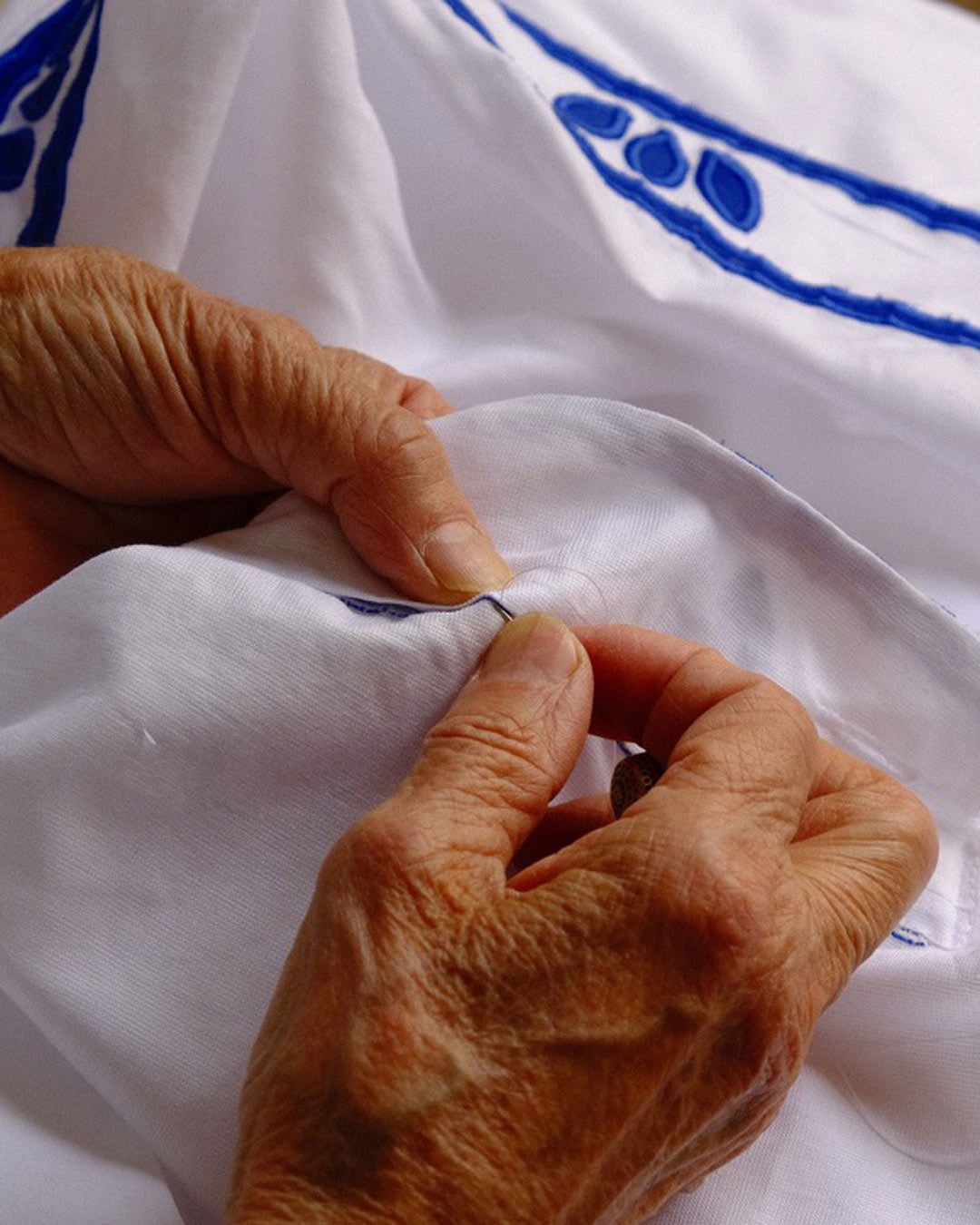 Elevate your wardrobe with a timeless piece crafted from 100% fine cotton, ensuring a luxurious silky soft feel against your skin. Adorned with meticulously detailed white embroidered flower petals along the collars and hems, each stitch is imbued with loving care. Finished with exquisite mother-of-pearl buttons and two sophisticated pockets, this pyjama set is not just comfortable for sleeping, but perfect for any occasion, whether it's a casual outing or a night on the town. In collaboration with celebrated dressmaker Angelo Inglese, each pyjama set is handmade lovingly by artisans in the sleepy town of Ginosa, Puglia using age-old traditional techniques. Trust us, it's a must-have.