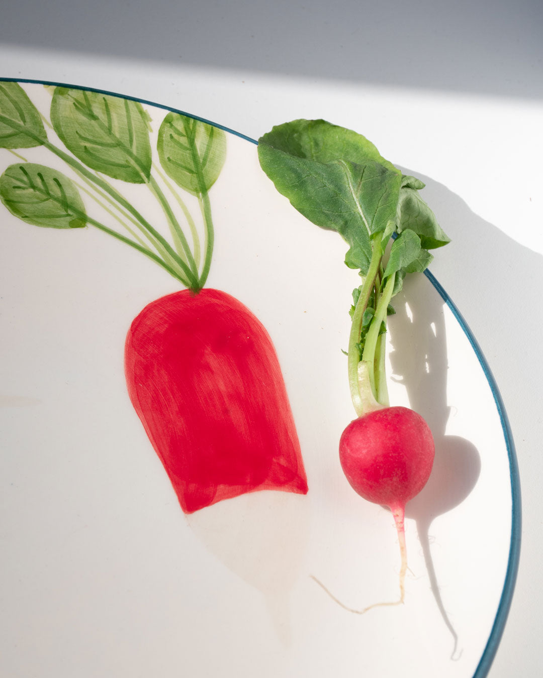 The Radish Large Plate is a bright hand-painted platter great to serve a large cake or appetizers.