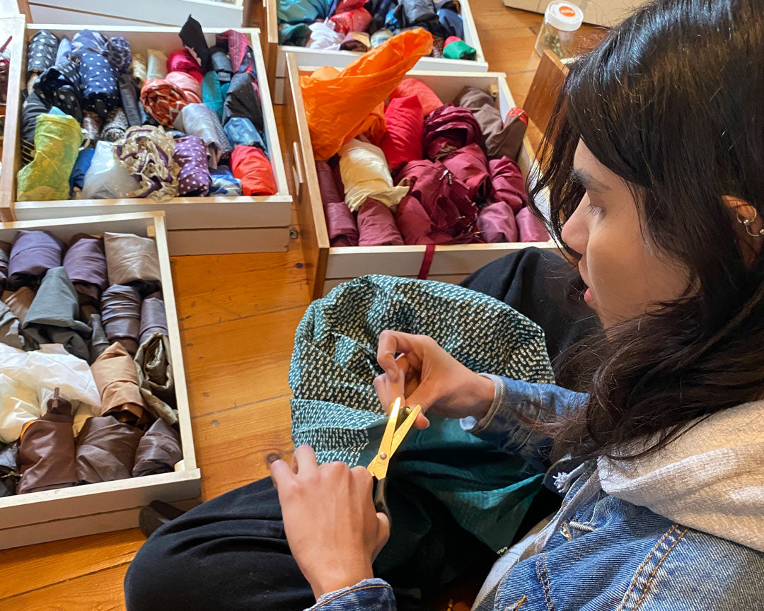 R-Coat a une production artisanale à petite échelle. Les parapluies cassés proviennent d'un de nos nombreux points de collecte et leur tissu est préparé (coupé, lavé et repassé) par les membres de l'équipe à Lisbonne, où ont également lieu le contrôle qualité et l'expédition. Le tissu mort pour la doublure provient de l'usine textile portugaise Tetribérica et la couture est réalisée dans un petit atelier à l'extérieur de Lisbonne par une équipe de 5 couturières.