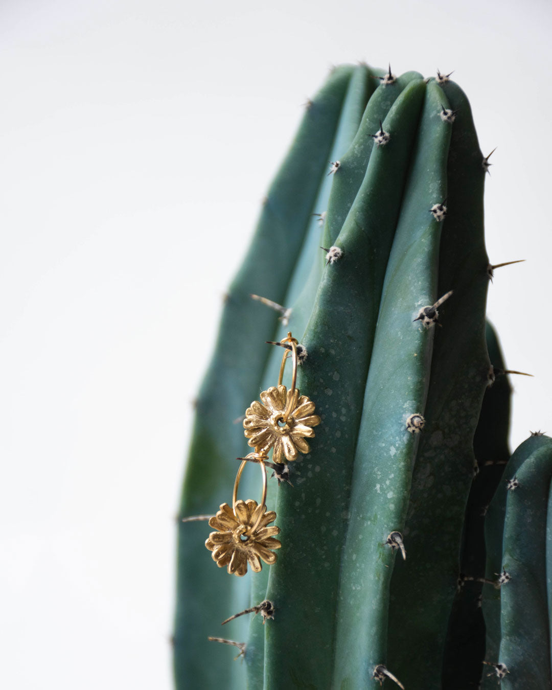 Deux marguerites en bronze jaune et cercles en argent doré.
