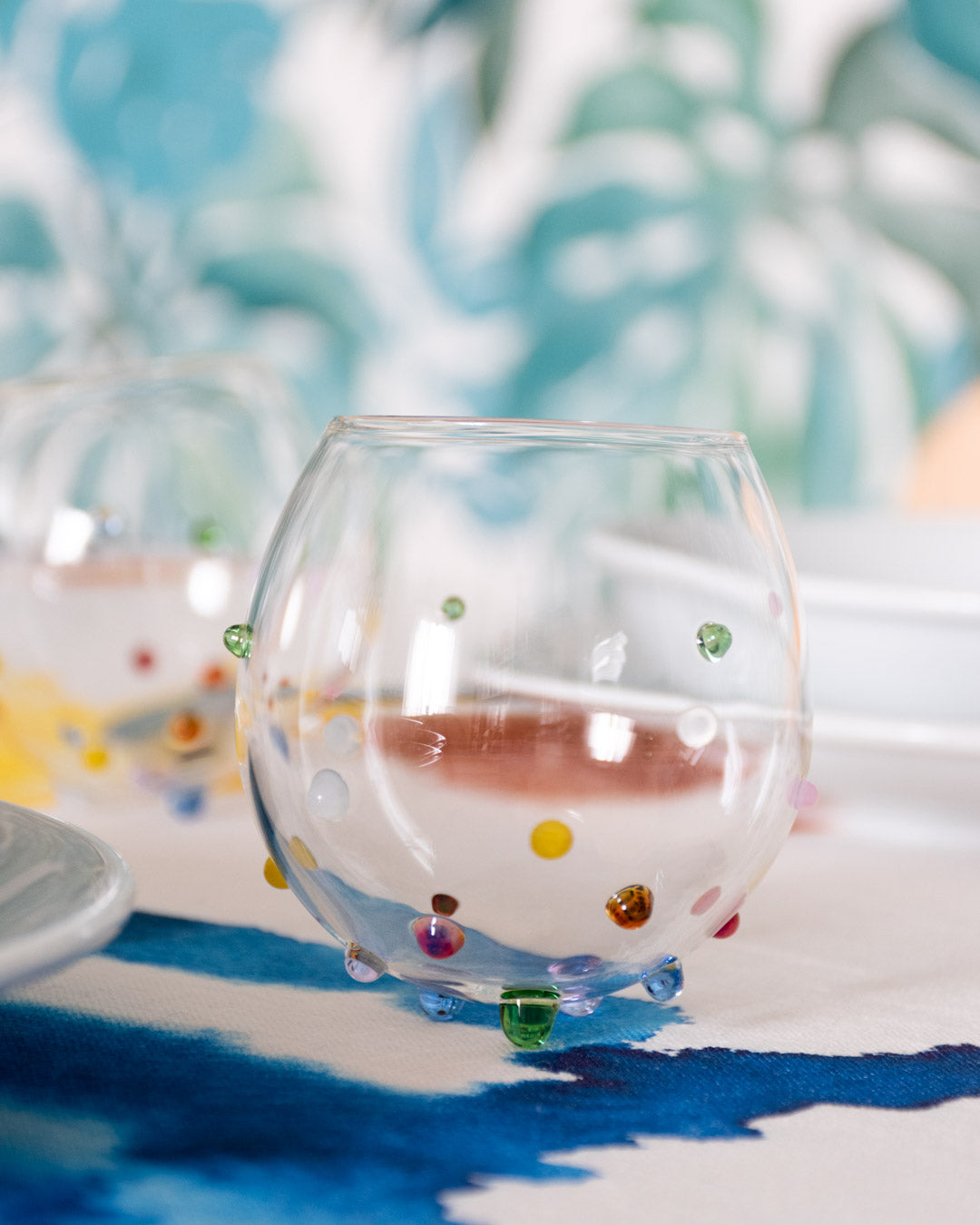 Lot de 6 verres soufflés à la bouche. Chacune de ces pièces est unique et décorée de points de couleurs différentes. Rendez vos repas spéciaux et surprenez vos invités !