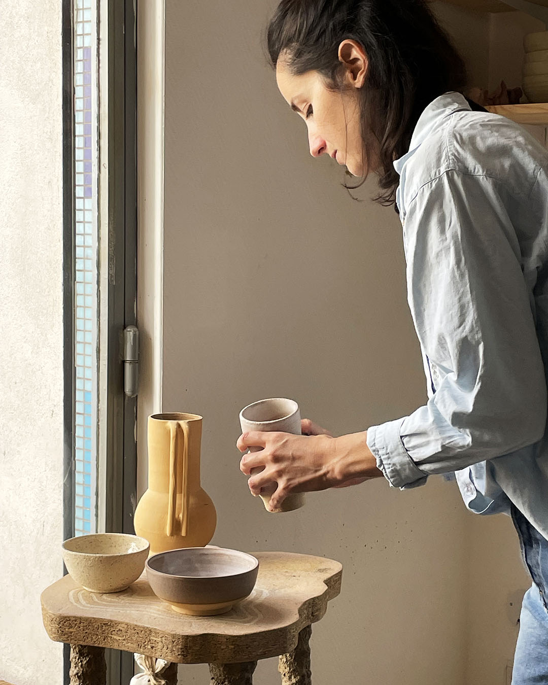 Le pichet de sable mat est réalisé avec de l'argile sableuse beige rappelant les paysages méditerranéens. Il est jeté au tour, émaillé à l'intérieur en blanc mat et cuit à haute température qui lui confère sa résistance. L'émail offre des nuances de couleurs selon son épaisseur, il est alimentaire. Avec sa forme ergonomique, il s'adaptera facilement sur votre table au quotidien. Chaque pichet est unique et variera légèrement d'une pièce à l'autre. La vaisselle est créée avec soin dans le sud de la France, à Marseille, en petites séries par Julie Landemarre