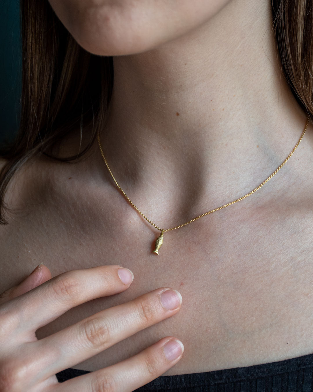Questa collana Pesce è realizzata a mano da Bona Calvi con la tecnica della cera persa.