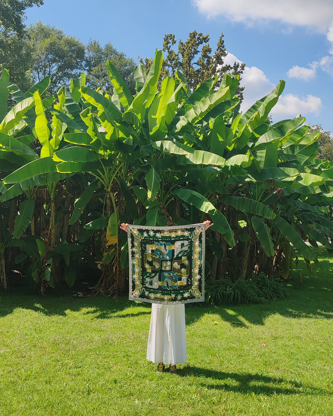 Mon Lien creates its accessories through a unique creative process. Each design begins with a theme, with hand-drawn elements that are digitized and composed into a carré format.