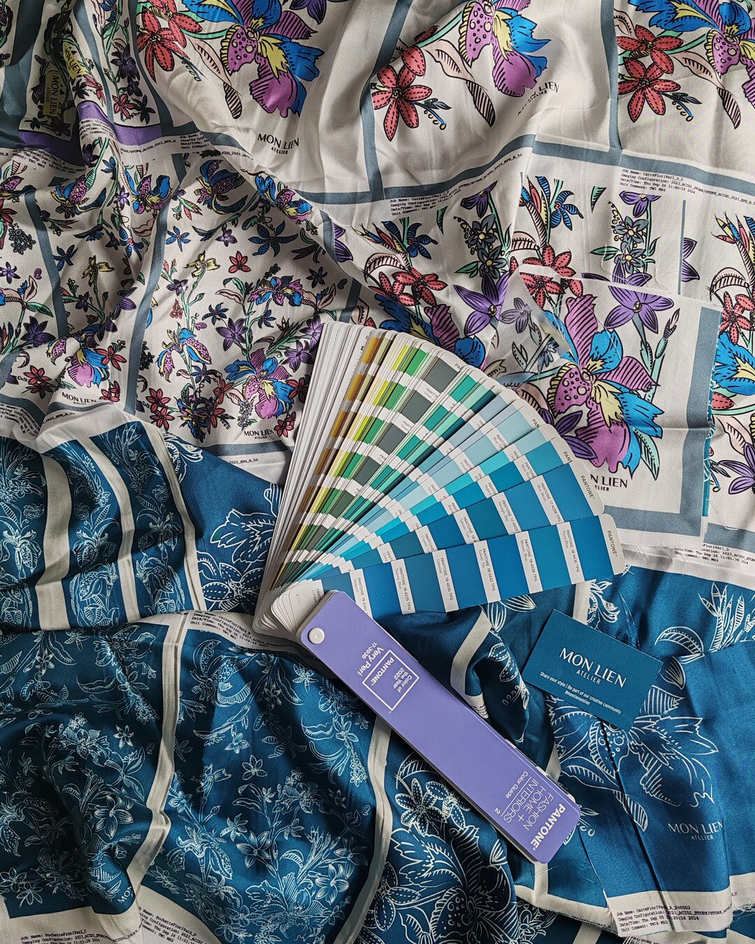 After selecting the color harmony, the file is sent to Como for variant tests, followed by printing production. Each format is designed with a new composition of patterns to allow "matchy-matchy" combinations within the collection, while preserving the uniqueness of each person who wears them, but offering an emotional bond with a special person, connected through the silk and the chosen design.