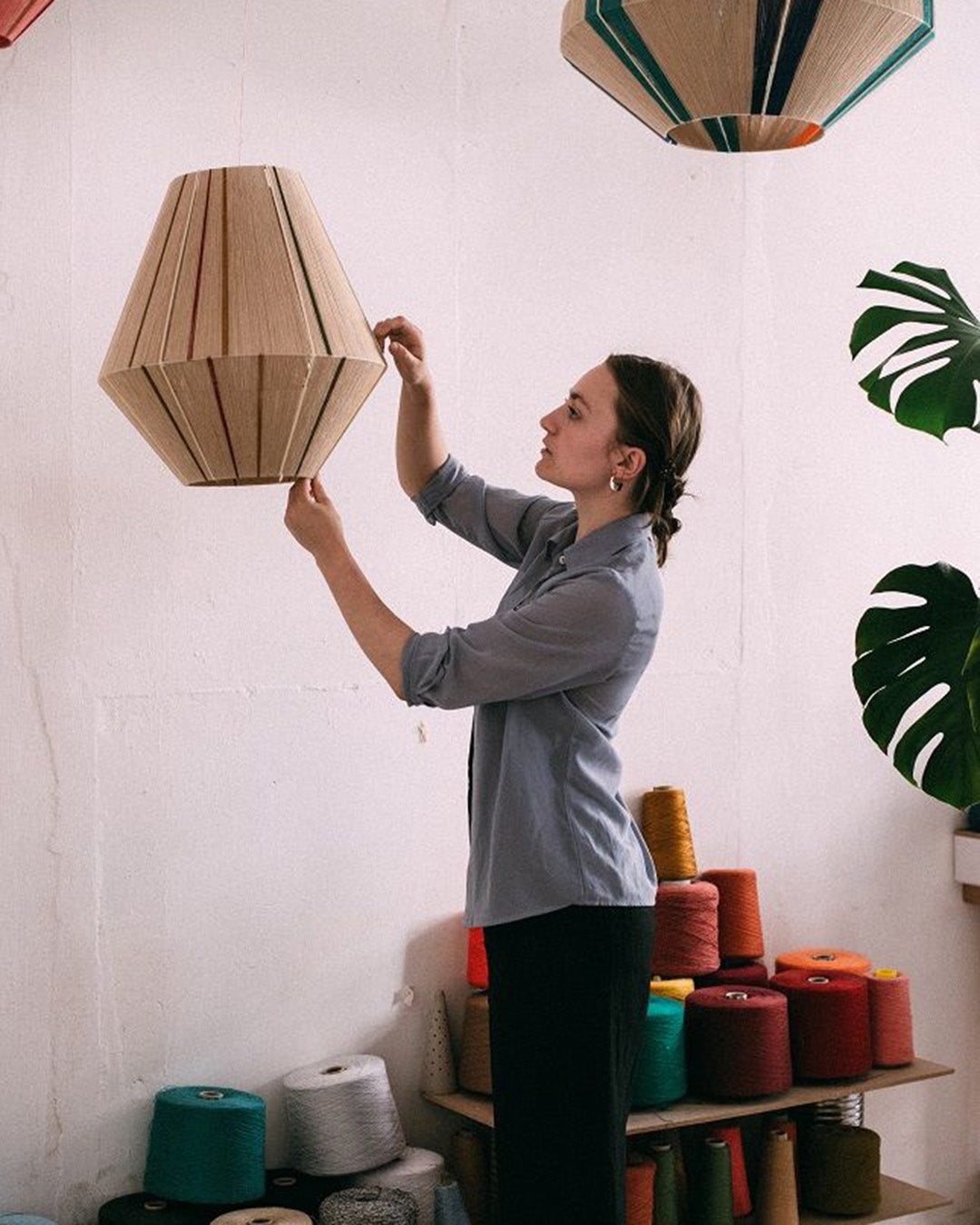 Le loro strutture strutturali verniciate sono prodotte da un laboratorio locale di metalli e Heymann le tesse a mano nel suo studio con filo di cotone italiano.
