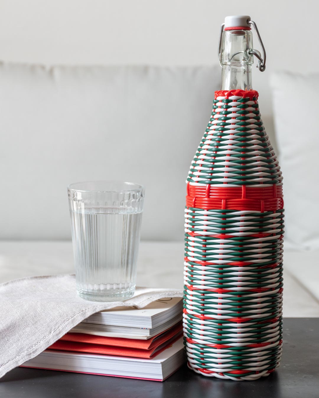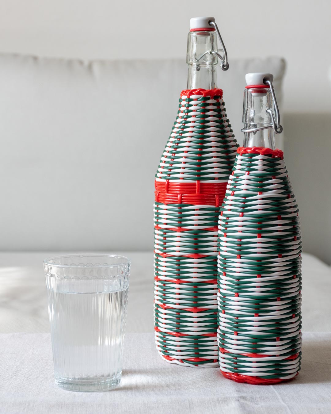 Bottiglie decorate a mano con cavo in PVC, reinterpretando la tecnica utilizzata per decorare le brocche di sangria negli anni '50. Possono essere lavate e conservati in frigorifero. Design e produzione a cura di Casa Atlântica.
