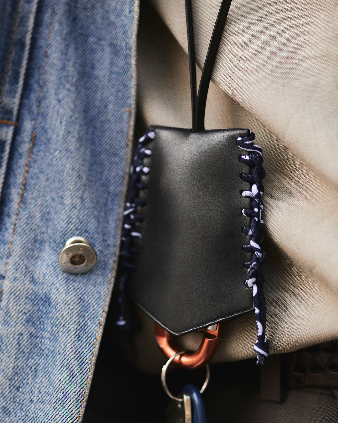 Tieni al sicuro le tue chiavi e non dimenticarle mai con questo bellissimo articolo in pelle. È disponibile in quattro colori classici e intramontabili di pelle di vitello, ravvivati da cordoncini ricoperti da una bandana, che rivisita le tradizionali tecniche di intreccio della pelle utilizzate nella selleria e in alcuni folklore.