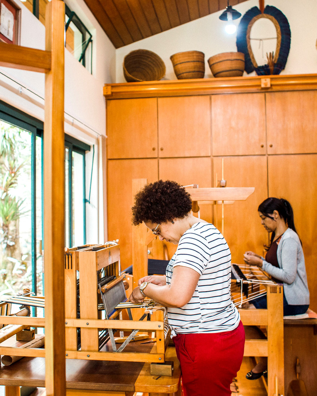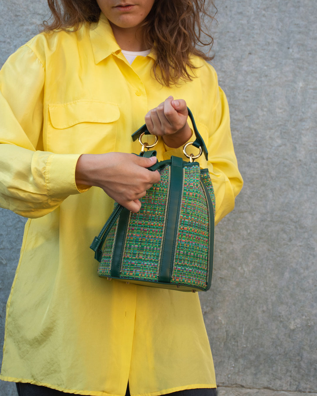 Questa borsa è realizzata in Italia con pelle e tessuto di provenienza etica intrecciati a mano in Brasile da artigiani locali. Il tessuto è fatto con fili di cotone al 100%.