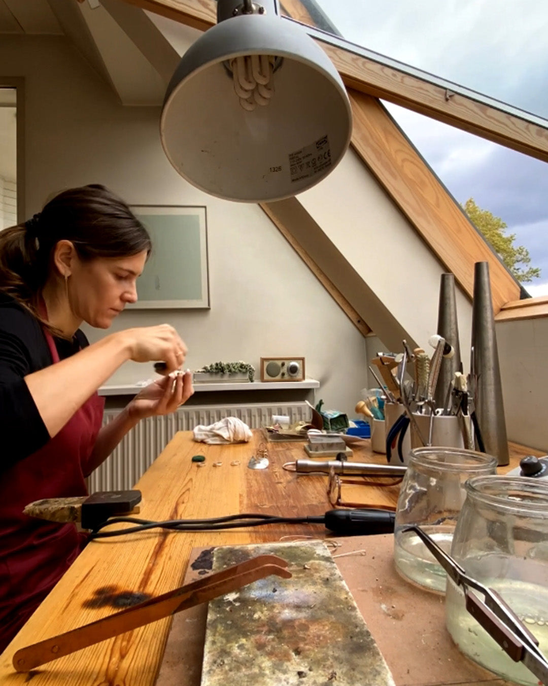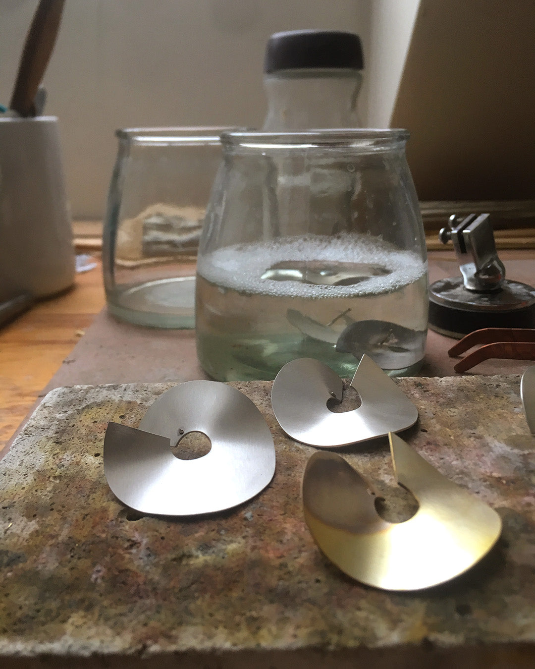 Orecchini dalla forma ondulata con finitura opaca. Ciascun orecchino appartiene esclusivamente a uno dei due orecchi. Per identificarlo, quando lo indossi, è importante controllare che l'estremità che circonda l'orecchio rimanga nascosta dietro l'orecchio stesso.