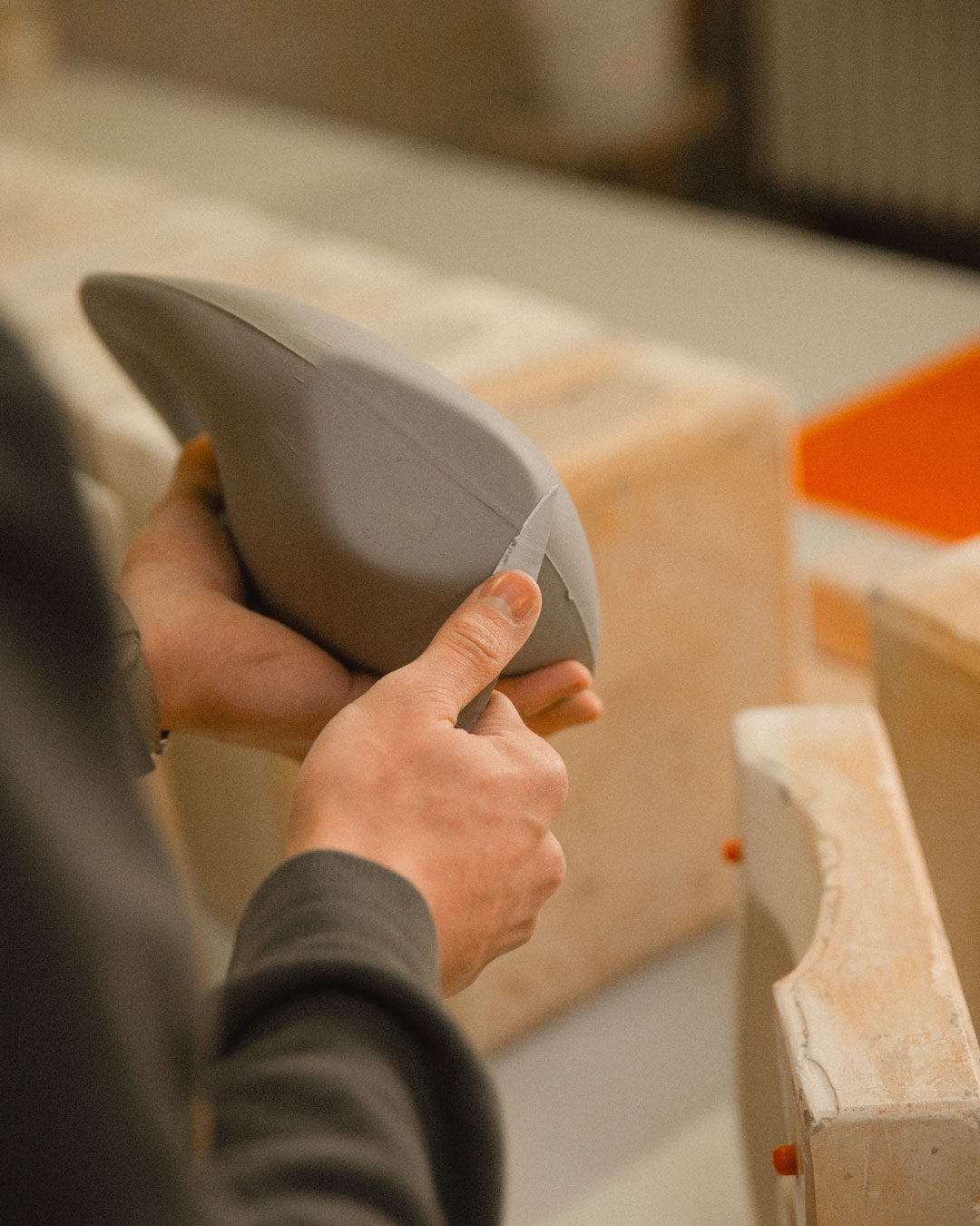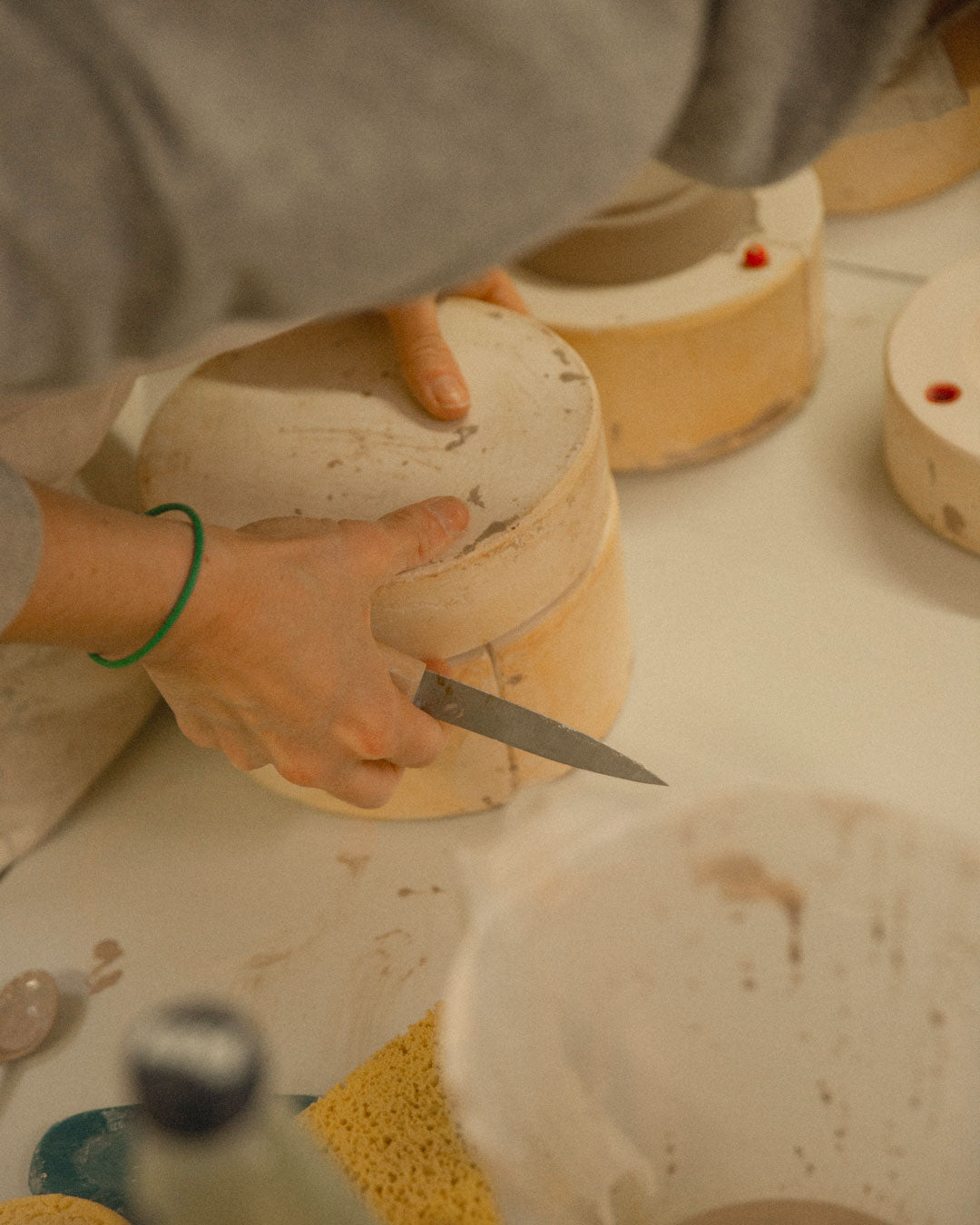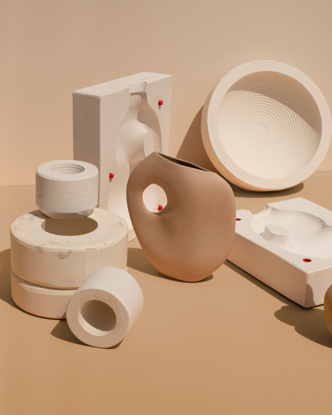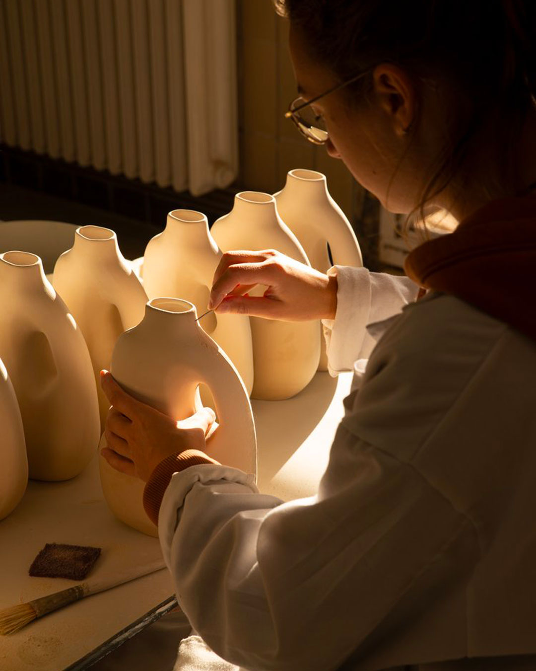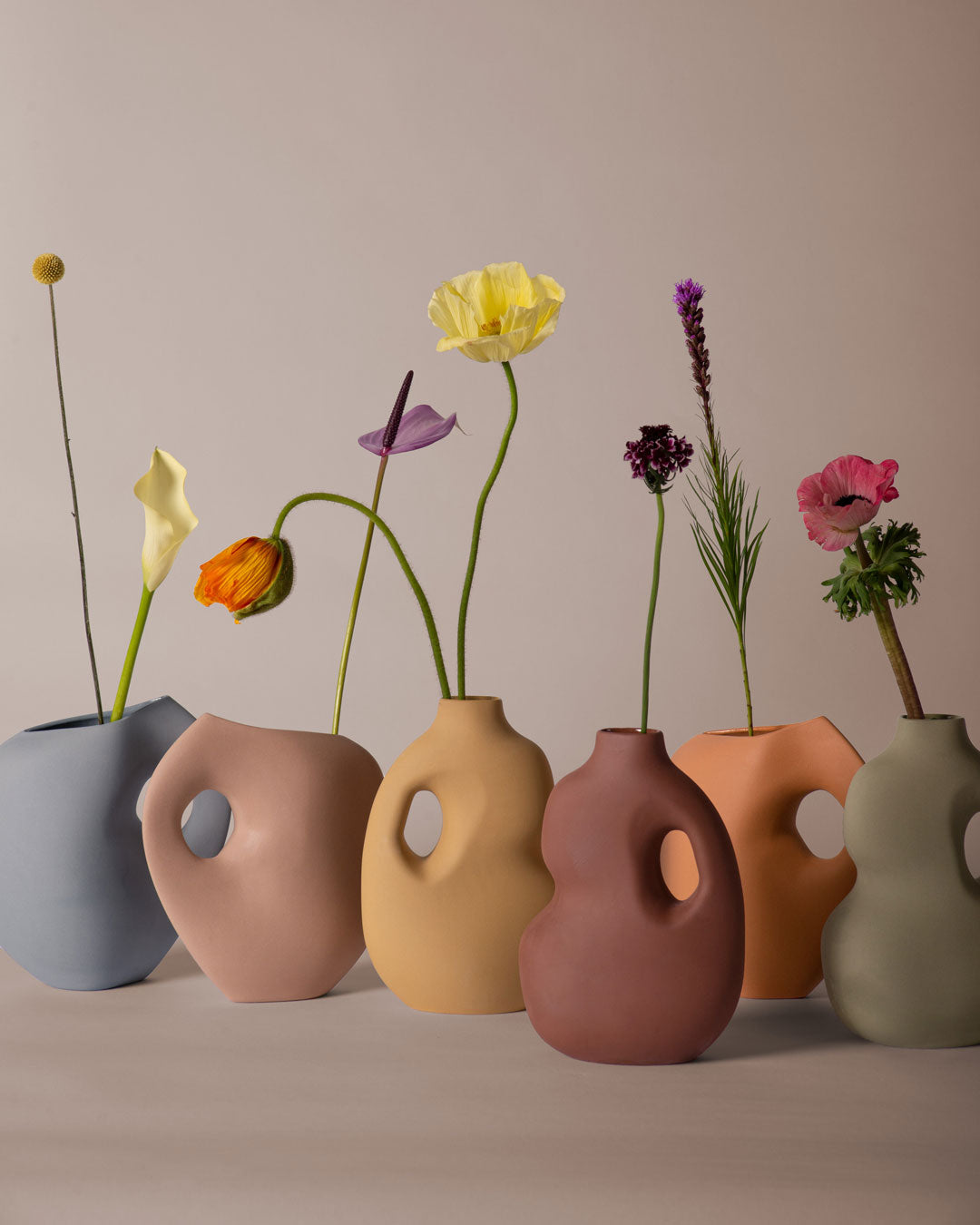 Expressive and soft in their forms, the imaginative Aura vases emerge from a poetic reflection on the curves of the female figure. Through a raw sensuous surface, the intense hues and varied tones of rich or subdued colors give a quiet but tense feel, elevated by the soft reflection of light. Simultaneously abstract and familiar, the stoneware object blurs the line between everyday piece and sculpture.