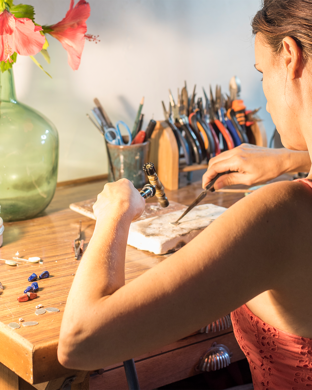 The earrings combine simple volumes and geometric shapes in varying sizes, colors, and textures of porcelain and silver. Each small piece that forms the jewelry is aligned and spaced along the main axis, creating a balanced design.